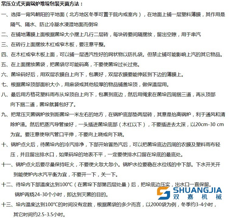 湖北雙嘉機械是專業(yè)食用菌設備廠家,主營全自動裝袋機、裝袋扎口、扎繩、窩口一體機、微壓高溫滅菌柜、智能烘干機、菌包全自動化生產(chǎn)線等,支持定制、上門安裝,為全國各大食用菌種植基地與合作社,提供一站式設備解決方案。