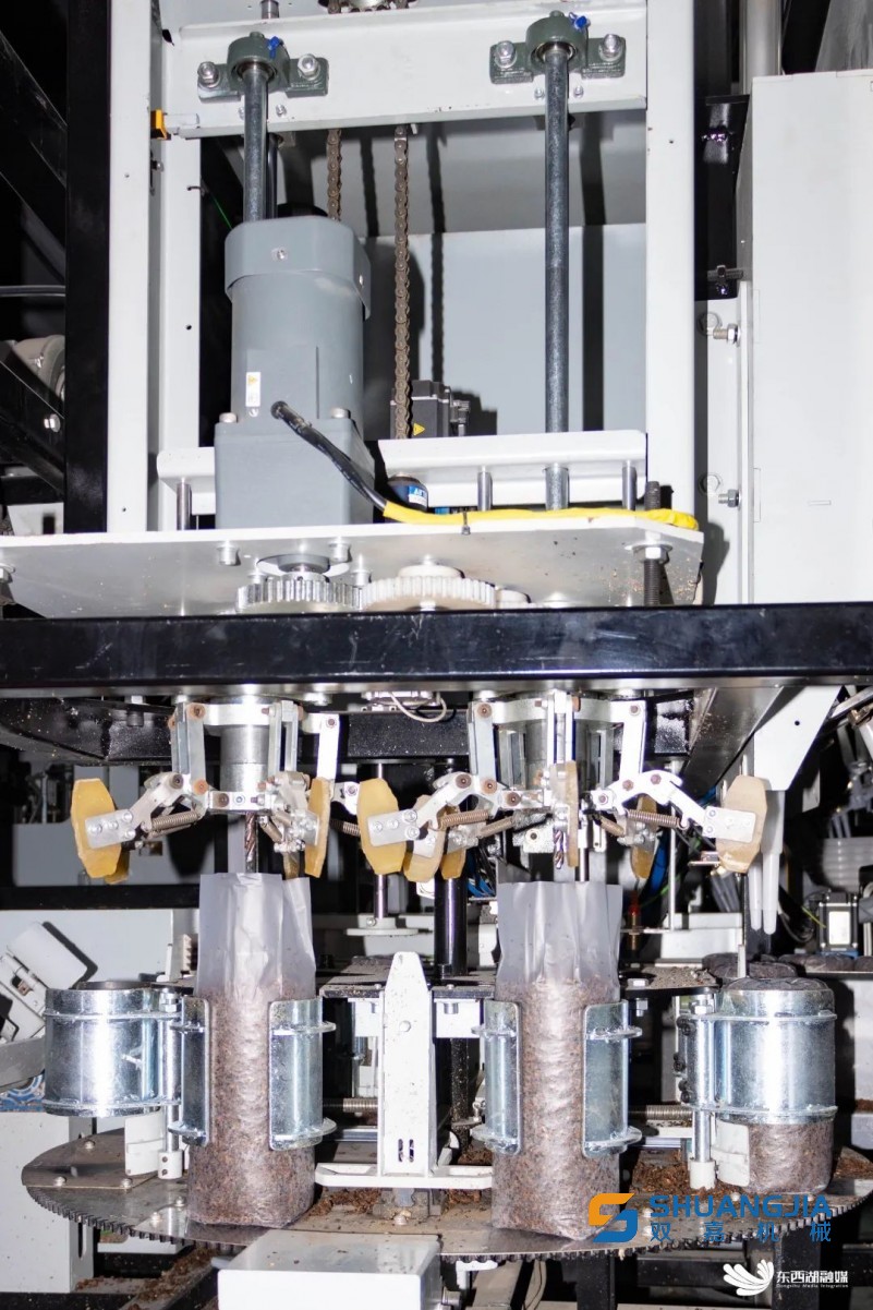 在自動裝袋區(qū),生產線代替人工完成套袋、填料、窩口、插棒、裝袋進筐等一系列復雜動作。立式螺旋填料方式讓裝料更密實,每包菌棒長度、重量一致。